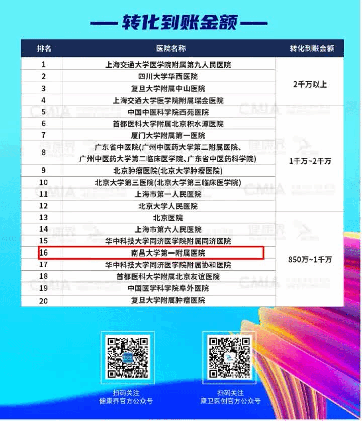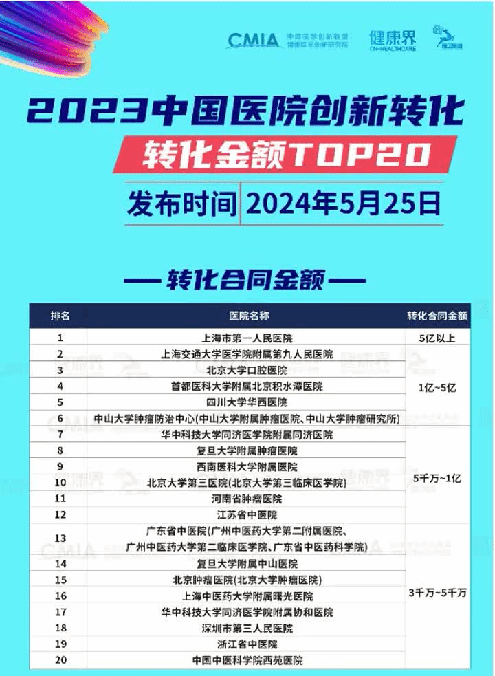 本網訊(第一附屬醫院)5月25日,在第六屆中國醫學創新聯盟(CMIA)醫學創新大會主論壇上,由CMIA和健康界聯合推出的《中國醫院創新轉化排行榜(2023)》重磅發布。在本年度排行榜中,我校第一附屬醫院榮獲綜合排名全國第44名、轉化到賬金額排名全國第16名的佳績,多項榜單位居全省醫療機構首位,這標志著第一附屬醫院已躋身全國醫學創新轉化先進行列,醫院科技成果轉化逐步駛入“快車道”。
