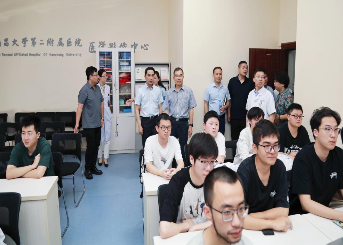 陳曄光一行實地調研了第一附屬醫院學生實操實訓室、“大思政課”實踐教學基地抗擊疫情專題展覽館、手術實驗室,第二附屬醫院智能醫療創新中心、臨床技能培訓中心等地,詳細了解教育教學、實踐實訓等情況。