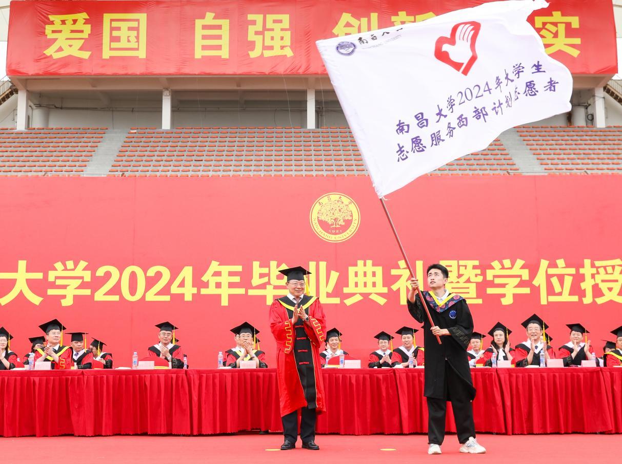 羅嗣海為2024年西部計劃志愿服務隊授旗。一面旗幟代表著南昌大學一批批西部計劃志愿者,用實際行動弘揚志愿精神的責任擔當,鼓舞著志愿者們在平凡崗位上堅守奮斗,在全新環境中錘煉本領,在西部的廣闊天地中唱響新時代的青春之歌,譜寫中國青年志愿者行動的南大篇章。志愿服務隊代表上臺接旗,全體師生校友高聲齊唱《歌唱祖國》,用激揚的歌聲表達牢記黨和人民重托、母校叮囑的決心。