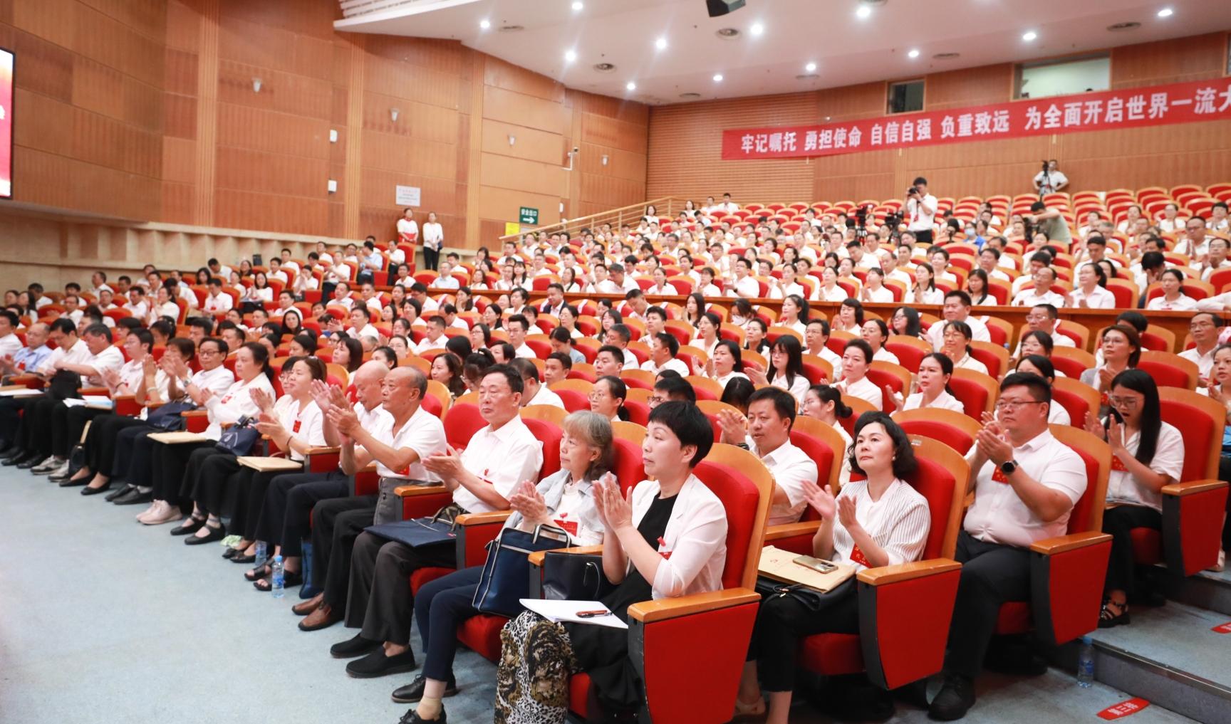 前湖校區音樂廳氣氛莊嚴熱烈。主席臺上方懸掛著中國共產黨黨徽,十面鮮艷的紅旗分列兩側。上午9時,大會在雄壯激昂的國歌聲中開幕。