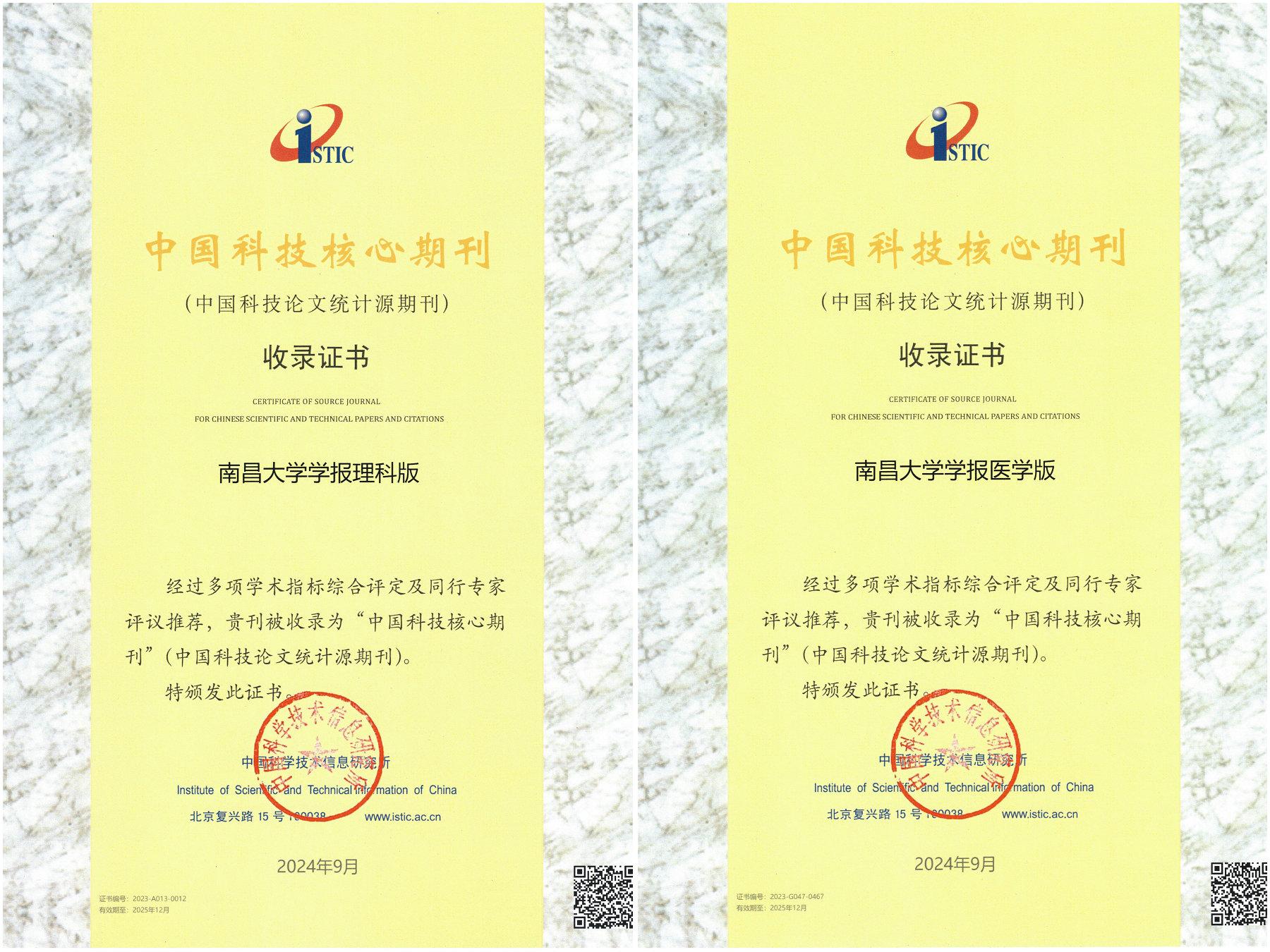 本網訊(期刊社)9月20日,“2024年中國科技論文統計結果發布會暨中國一流科技論文世界影響力評價論壇”在北京召開,《南昌大學學報(理科版)》《南昌大學學報(醫學版)》兩刊經過多項學術指標綜合評定及同行專家評議推薦,被收錄為“中國科技核心期刊”(中國科技論文統計源期刊)。