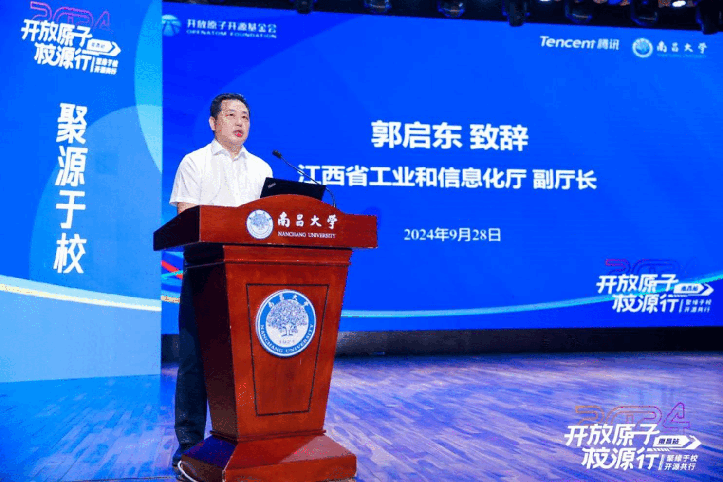 本網(wǎng)訊(軟件學(xué)院)為推廣開源文化,傳播開源理念,培養(yǎng)開源軟件生態(tài)人才,9月28日,2024年開放原子校源行(南昌站)活動(dòng)在南昌大學(xué)舉辦。省工業(yè)和信息化廳黨組成員、副廳長郭啟東,南昌大學(xué)副校長杜建強(qiáng),開放原子開源基金會(huì)理事長程曉明出席開幕式。