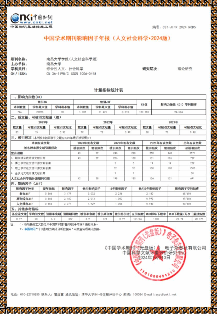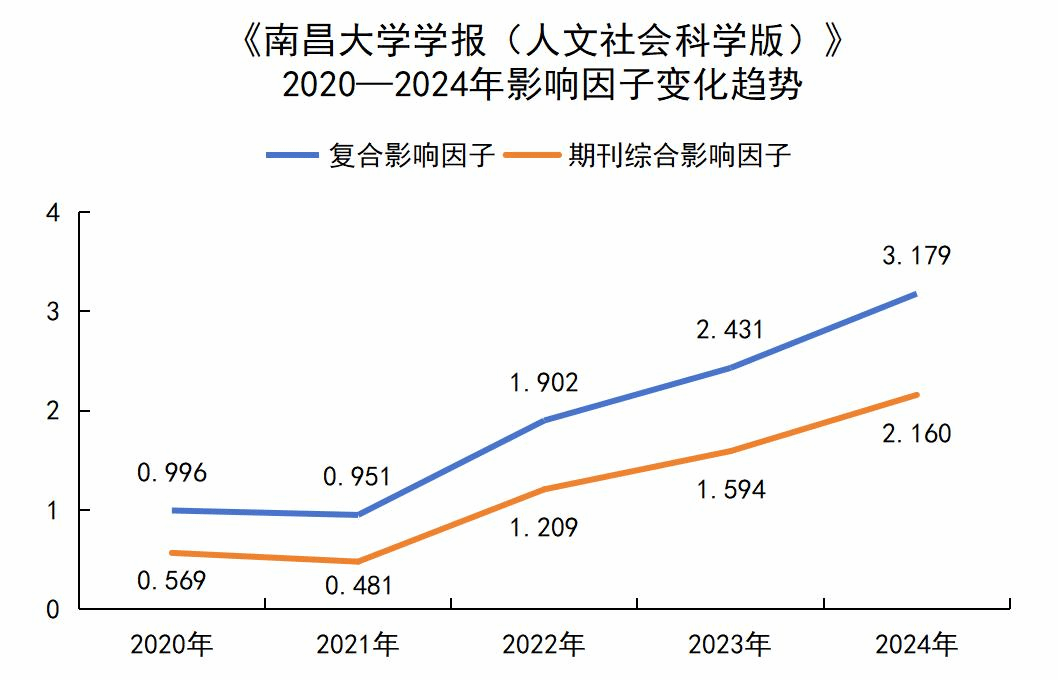 本網訊(通訊員廖金萍)近日,據中國科學文獻計量評價研究中心《中國學術期刊影響因子年報(人文社會科學·2024版)》數據顯示,《南昌大學學報(人文社會科學版)》2023年的各項影響力指標再創歷史新高,復合影響因子首次突破3.0,達到3.179,較去年的2.431增長了30.77%;期刊綜合影響因子提升到2.160,較去年的1.594增長了35.51%。近年來,《南昌大學學報(人文社會科學版)》的復合影響因子、影響力指數持續提檔進位。