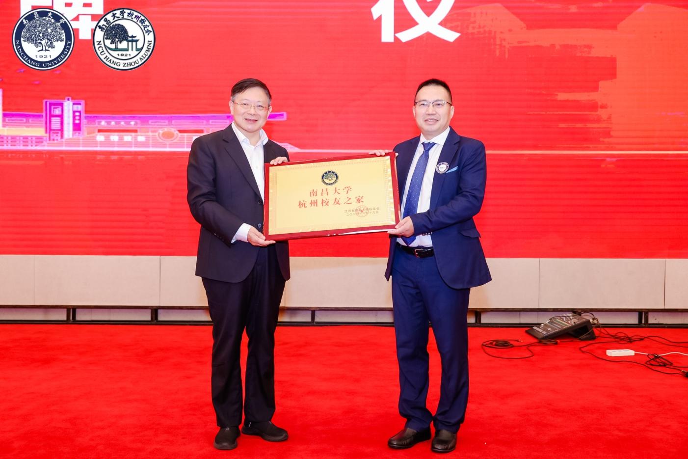 羅嗣海向新當選的校友會會長劉海兵授牌“南昌大學杭州校友之家”,并為南昌大學杭州校友會終身名譽會長傅通先、名譽會長吳新高授牌。