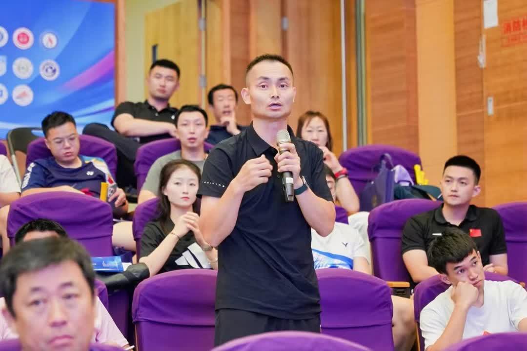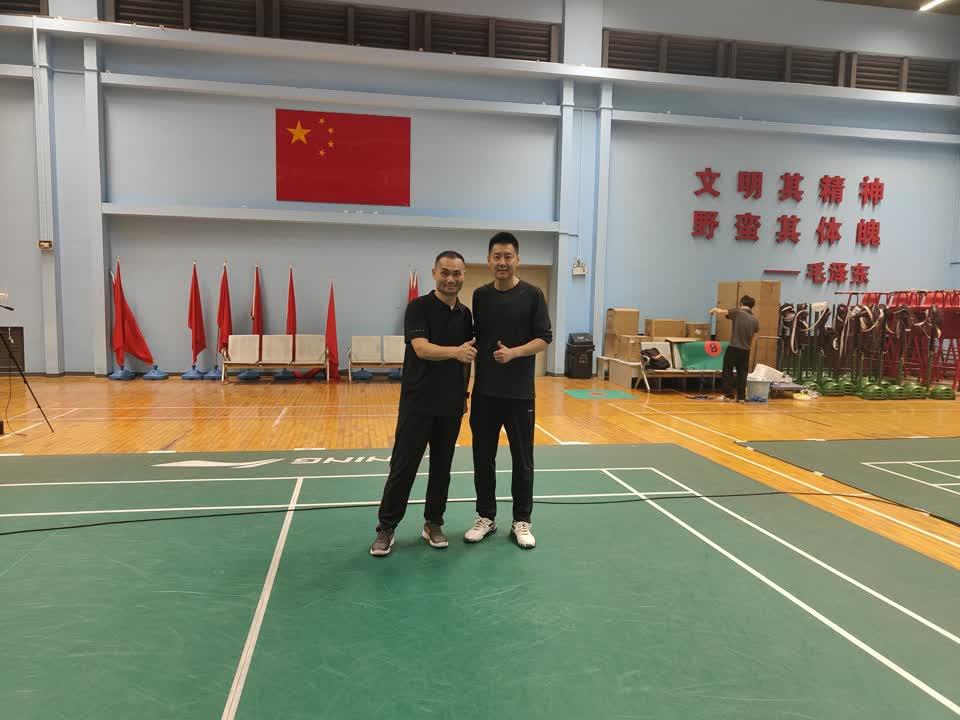 吳斌老師與同臺競技的世界羽毛球冠軍、哈爾濱工業大學陳金老師交流