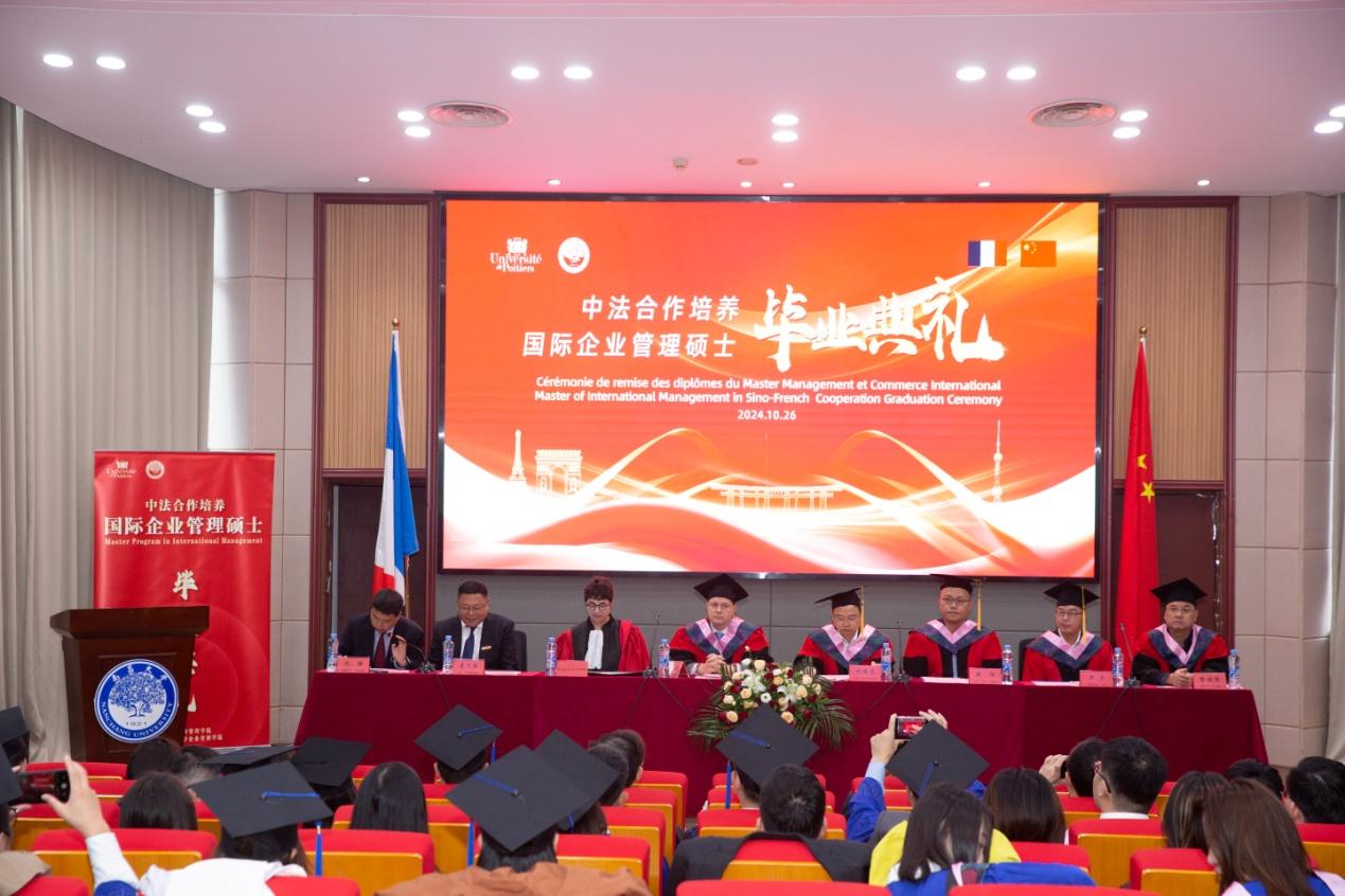 江西省外事辦公室,學校研究生院、國際合作與交流處、中法中心,法國駐武漢總領館相關負責人及畢業生參加典禮。