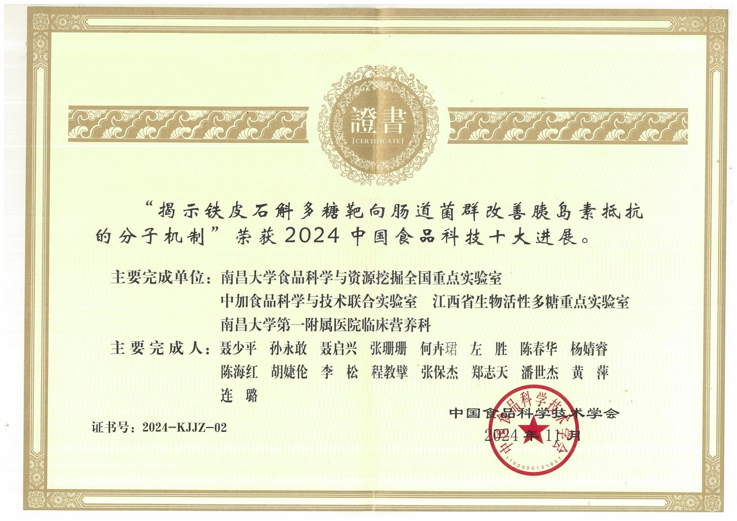 本網訊(食品學院)11月3日,在中國食品科學技術學會第二十一屆年會上,發布“2024中國食品科技十大進展”。該獎項由中國食品科學技術學會組織,通過自主申報、形式審查、答辯和專家評審,我校食品學院聶少平教授團隊科研成果“揭示鐵皮石斛多糖靶向腸道菌群改善胰島素抵抗的分子機制”成功入選,主要完成人為聶少平、孫永敢、聶啟興等。
