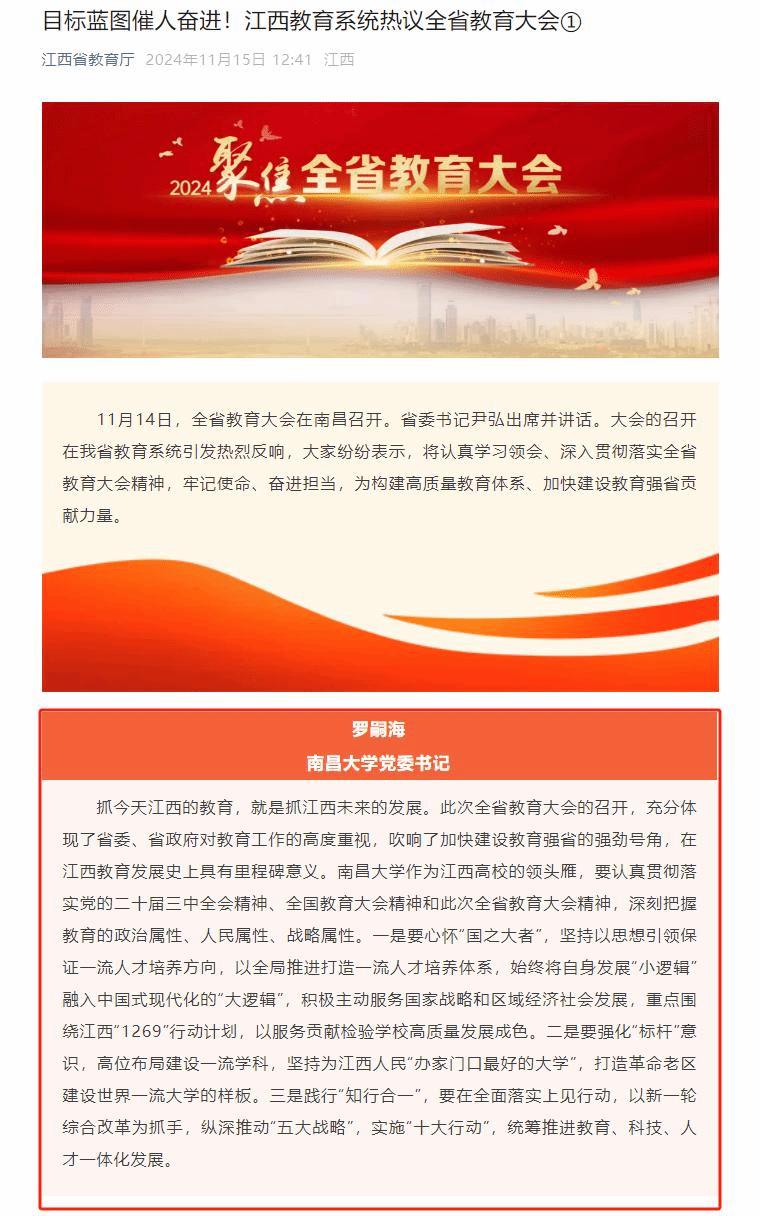 編者按:11月15日,江西省教育廳公眾號(hào)以《目標(biāo)藍(lán)圖催人奮進(jìn)!江西教育系統(tǒng)熱議全省教育大會(huì)》為題,刊發(fā)我校黨委書記羅嗣海等高校黨委書記結(jié)合高校實(shí)際暢談參會(huì)感想。詳情如下: