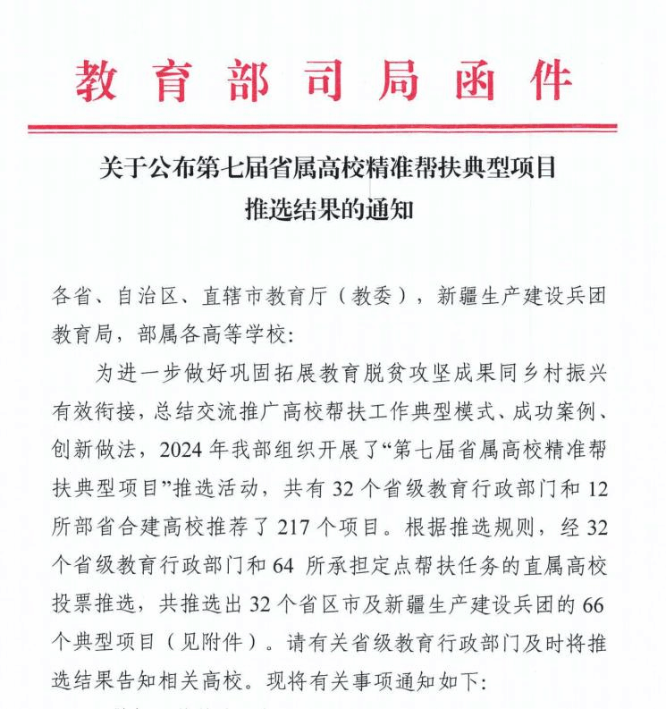 本網(wǎng)訊(黨委組織部、資源與環(huán)境學(xué)院)近日,教育部公布了第七屆省屬高校精準(zhǔn)幫扶典型項(xiàng)目推選結(jié)果。全國32個省級教育行政部門和12所部省合建高校推薦了217個項(xiàng)目,經(jīng)32個省級教育行政部門和64所承擔(dān)定點(diǎn)幫扶任務(wù)的直屬高校投票推選,共推選出32個省區(qū)市及新疆生產(chǎn)建設(shè)兵團(tuán)的66個典型項(xiàng)目,我校組織申報的資源與環(huán)境學(xué)院《“兩山”轉(zhuǎn)化增福祉,生態(tài)產(chǎn)業(yè)促民富》項(xiàng)目成功入選,這是該項(xiàng)目自遴選以來,我校第4次獲此殊榮。