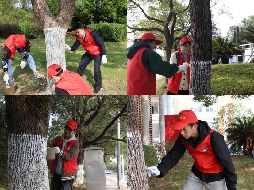 在校園五四大道的兩邊,可以看到一群身著紅色背心的志愿者們正在給樹木刷防蟲涂料,這是劉建光與100余名師生志愿者們一同在校園內開展樹木養護志愿服務活動,志愿者們攜帶勞動工具,沿著圖書館——嘉言路北門,一路為樹木刷上防蟲涂料,以實際行動建設綠色校園。