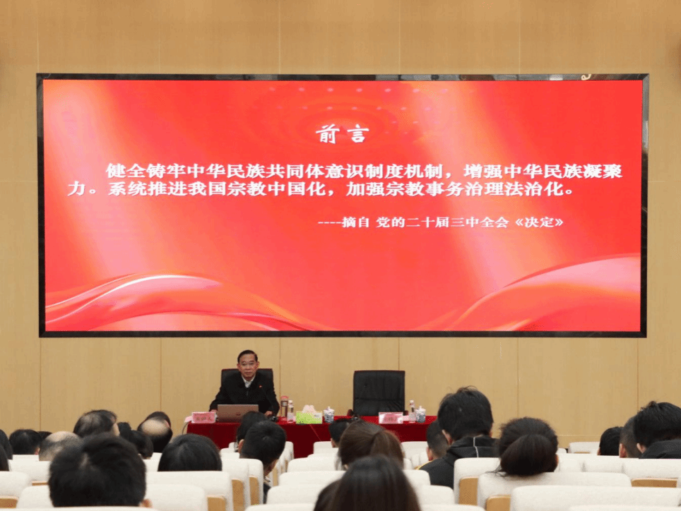滕勇前作題為《深入學習貫徹黨的二十屆三中全會精神 不斷鑄牢中華民族共同體意識 抵御和防范宗教向高校滲透》的主題授課?!笆裁词恰腥A民族’、什么是‘中華民族共同體’、什么是‘中華民族共同體意識’”,滕勇前以逐層遞進的三問,引入“鑄牢中華民族共同體意識”的核心要義。他強調,要秉持鑄牢中華民族共同體意識這條主線,不斷探索高校民族團結進步宣傳教育新載體,營造好各民族學生“共居共學、共事共樂”的校園文化氛圍,在潛移默化之中讓“四個與共”“五個共同”“五個認同”入腦入心。針對高校抵御宗教滲透和防范校園傳教工作,他結合實際工作案例進行深入剖析,提煉出五大工作方法,為學院扎實做好宗教工作提供了新思路。