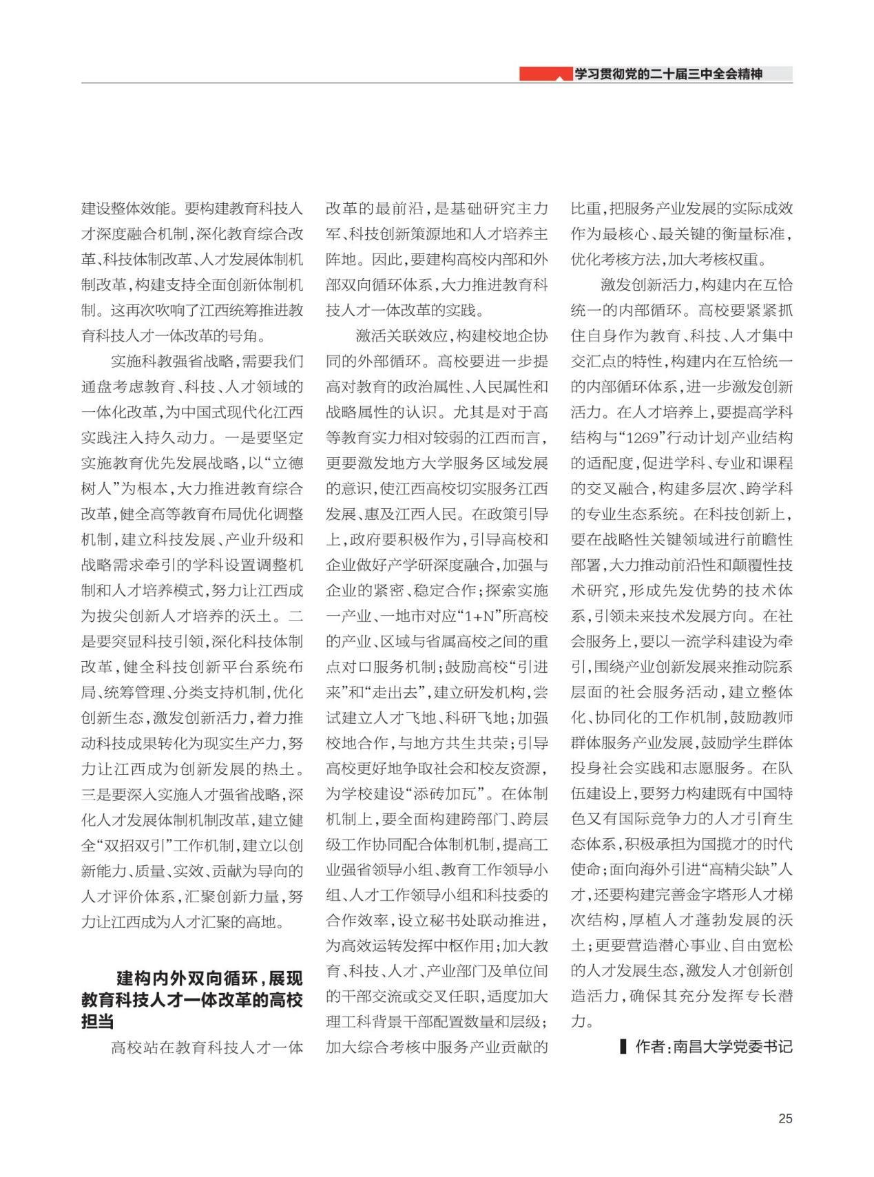 編者按:《當代江西》雜志社2025年第1期刊發我校黨委書記羅嗣海署名文章《在推進教育科技人才深度融合中展現高校擔當》,文章闡釋了教育科技人才一體改革的內在邏輯,系統解讀了江西統籌推進教育科技人才一體改革的具體思考,并提出了建構高校內部和外部雙向循環體系為中國式現代化江西實踐提供有力支撐的具體舉措。詳情如下:
