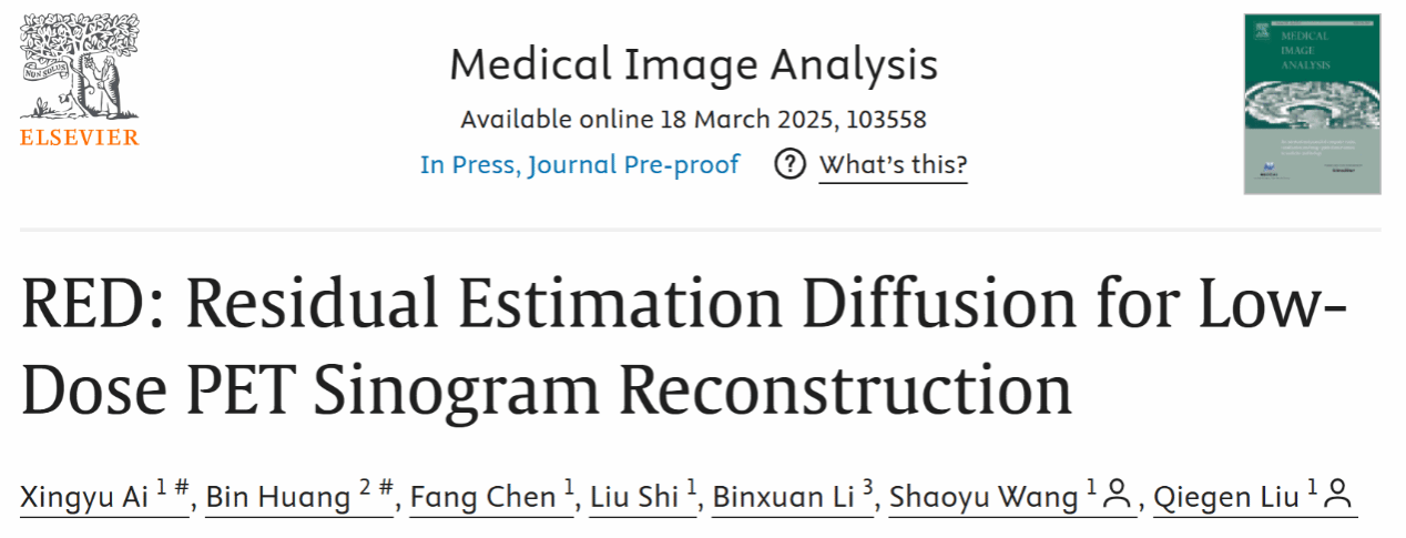 本網訊(信息工程學院)日前,醫學圖像分析領域頂級期刊Medical Image Analysis(中國科學院大類一區Top期刊,IF:10.7)上刊登發表了我校成像與視覺表示課題組的論文“RED: Residual Estimation Diffusion for Low-Dose PET Sinogram Reconstruction”。論文第一作者是信息工程學院科研助理艾星宇和數學與計算機學院2022級博士研究生黃彬,指導老師為信息工程學院王少宇副教授、施柳副研究員、劉且根教授和合作單位合肥綜合性國家科學中心人工智能研究院李炳軒副研究員。