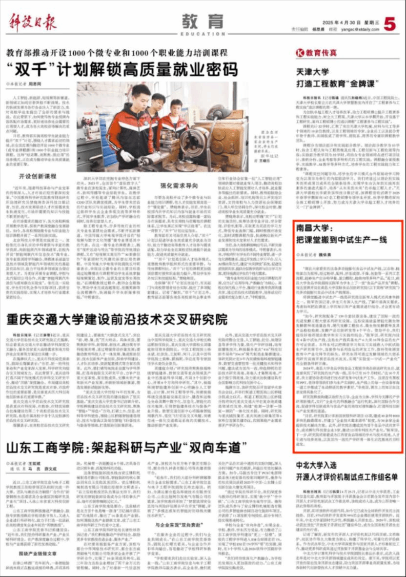 編者按:4月30日,《科技日報》以《南昌大學:把課堂搬到中試生產一線》為題,報道南昌大學國際食品創新研究院將課堂搬進中試生產一線,創新產學研用新模式,實行“企業化的科教融合”運行機制,促進學科創新成果與食品產業高效對接和融合,打通科技創新與產業發展通道。內容如下: