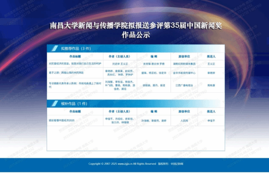 根據中華全國新聞工作者協會給各教研機構報送單位的相關通知要求,2025年5月26日,我院第35屆中國新聞獎初評委員會本著公開透明、客觀公正的原則,對參評作品進行了認真審核與評議,并經投票選出3件作品上報中國記協評獎辦參加終評。現按照得票順序,將初評結果公示如下: