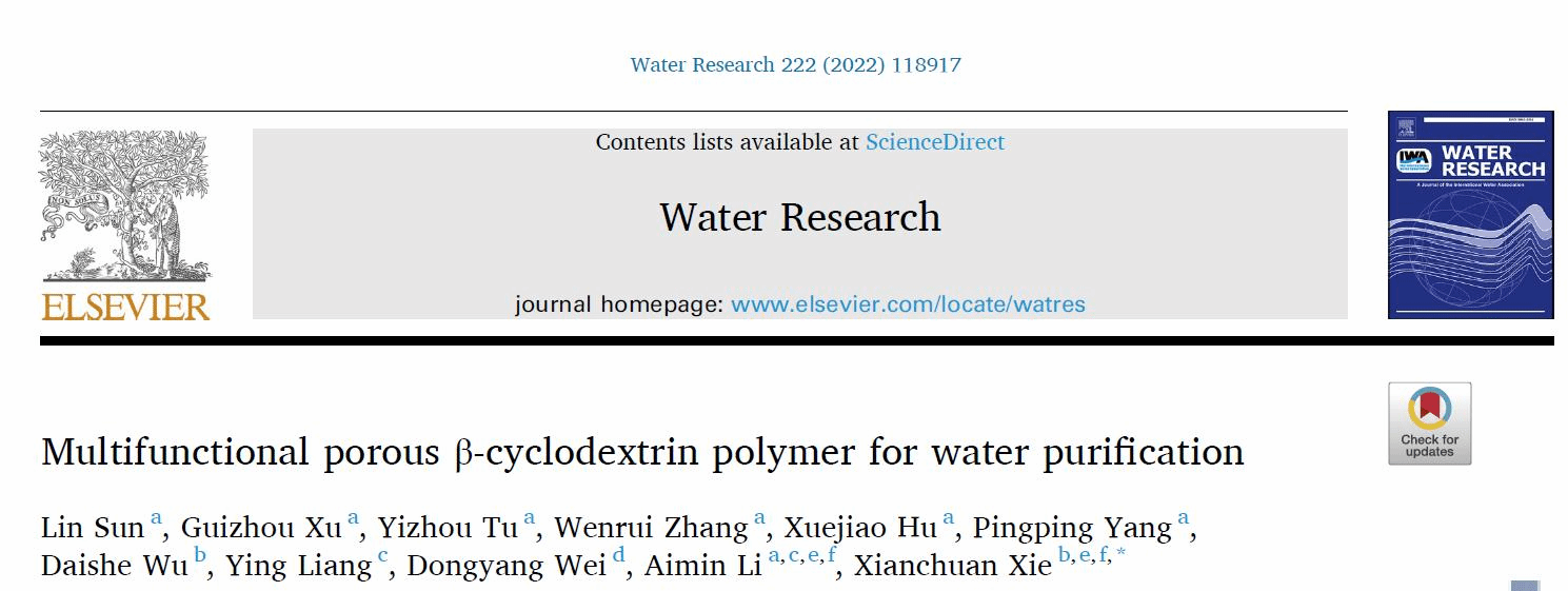 團隊研發多功能多孔β-環糊精聚合物用于水質凈化。水環境中的多種污染物對人類健康和生態安全構成嚴重威脅。其中,內分泌干擾物、持久性有機污染物(POPs)、抗性素等有毒有機新污染物給水環境和人類健康帶來風險,受到人們普遍關注。同時,水體中的天然有機物(NOM)不僅造成水體色嗅味感官指標的惡化,還是消毒副產物的前驅體,也影響其他有機和無機污染物的去除,給水處理帶來嚴峻挑戰。此外,水體中的病原微生物是水傳播疾病爆發的主要原因,也是水處理工藝重點控制目標物。目前,污水處理廠對有機污染物和微生物的去除往往需要兩個或多個工藝的耦合,工序繁瑣,增加了工程建設投資和運營成本。所以,迫切需要開發一種簡單的凈化材料及水處理工藝,以實現對水體中微污染物、天然有機物和病原微生物的同時去除。課題組研究團隊研制了季銨化環糊精基樹脂新材料,可高效吸附去除水體中常見的雙酚A (BPA)等有毒有機污染物和腐殖酸(HA)等天然溶解性有機物,對水中大腸桿菌等病原微生物兼有優良的滅/抑菌作用。研究結果以“Multifunctional porous β-cyclodextrin polymer for water purification”為題在Water Research(2022, 222: 118917)上發表。