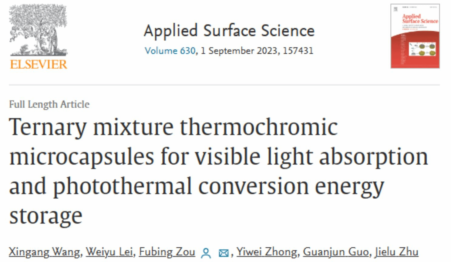 本網訊(工程建設學院)近日,我校工程建設學院王信剛教授、鄒府兵講師以及碩士生雷為愉等共同完成的論文Ternary mixture thermochromic microcapsules for visible light absorption and photothermal conversion energy storage在國際權威期刊Applied Surface Science(中科院大類一區,TOP期刊,2022年IF 6.7)上正式刊出。論文以南昌大學為唯一單位,王信剛教授為第一作者,鄒府兵講師為唯一通訊作者。