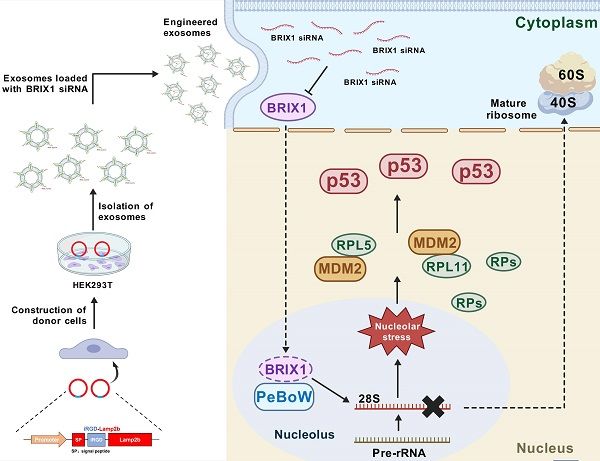 陳加祥團隊與復旦大學生物醫(yī)學研究院/附屬腫瘤醫(yī)院周祥團隊、南昌大學第一附屬醫(yī)院鄧軍團隊合作在Advanced Science(2024: e2407370. IF="14.3)期刊上發(fā)表了題為“Targeting" BRIX1 via engineered exosomes induces nucleolar stress to suppress cancer progression”的研究論文,論文第一作者為甘雨博士(我院2023屆博士,現為復旦大學博士后)和郝茜博士。研究團隊發(fā)現在腫瘤中高表達的核糖體生物合成相關蛋白BRIX1通過調節(jié)PeBoW(PES1/BOP1/WDR12)復合物促進核糖體RNA合成,同時還能夠直接與RPL5和RPL11結合,削弱核糖體蛋白對MDM2的抑制作用,從而促進MDM2對p53的泛素化降解。進一步研究發(fā)現,敲降BRIX1會抑制32S和12S 核糖體RNA前體的合成,從而誘導核仁應激,增強RPL5/RPL11與MDM2的相互作用,最終激活p53,該研究闡明了BRIX1調節(jié)核糖體生物合成和p53活性的分子機理。