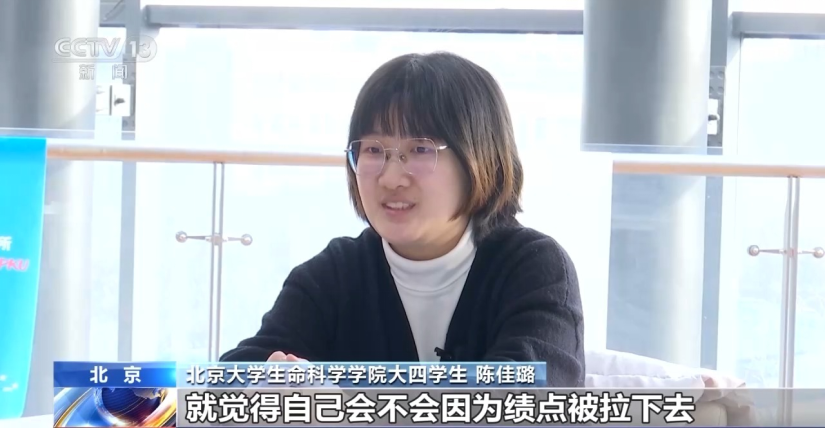 北京大學(xué)生命科學(xué)學(xué)院大四學(xué)生 陳佳璐:大一的時(shí)候有一些課其實(shí)學(xué)得不是特別好,像高數(shù)、大學(xué)物理這種,考了70多分,我當(dāng)時(shí)非常難過,覺得自己會(huì)不會(huì)因?yàn)榭?jī)點(diǎn)被拉下去,以后保不了研或者什么的,天臺(tái)上那一邊哭一邊給我媽打電話,我說這要完蛋了,大學(xué)生活要終結(jié)了。