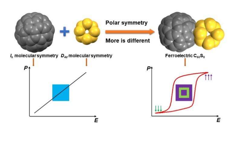 鐵電相變伴隨著空間對(duì)稱性的破缺,偶極有序排列引起的自發(fā)極化,僅存在于10個(gè)極性晶體點(diǎn)群(1 (C1),2 (C2),m (Cs),mm2 (C2v),4 (C4),4mm (C4v),3 (C3),3m (C3v),6 (C6),6mm (C6v))中。根據(jù)菲利普·安德森的“多則異”理念, 艾勇與廖偉強(qiáng)利用C60和S8分子設(shè)計(jì)合成了富勒烯加合物C60S8分子鐵電體。盡管兩個(gè)分子各自具有較高的分子對(duì)稱性,但研究表明,C60與S8的分子間相互作用導(dǎo)致了微小的結(jié)構(gòu)扭曲和晶格重疊,從而引起晶體的極性。在230開爾文的溫度下,C60S8發(fā)生了從極性到極性的鐵電相變,電滯回線測(cè)試和鐵電疇翻轉(zhuǎn)證實(shí)了它的鐵電性質(zhì)。