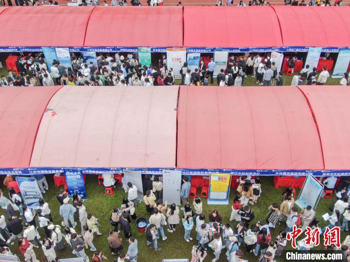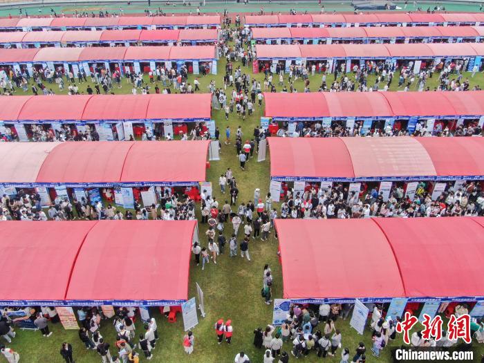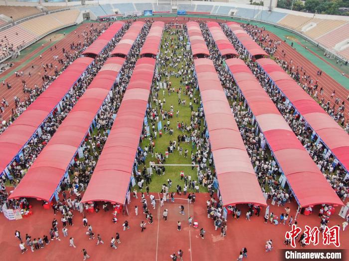 圖為航拍雙選會現(xiàn)場,眾多畢業(yè)生在尋找工作機會。