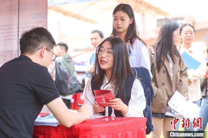 圖為雙選會現(xiàn)場,畢業(yè)生在同企業(yè)招聘人員交談。