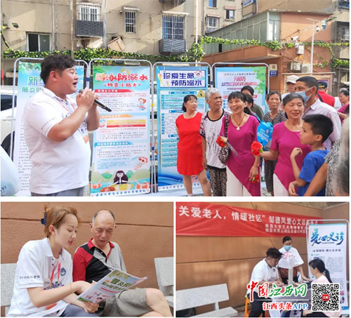 “針對新冠病毒,如何消毒?”“如果發生溺水,如何正確施救”?!胺酪咔榉滥缢彪p防宣講,藝術香樟暑期文明實踐隊走進社區,張貼宣傳標語、發放倡議書,現場用普通話和方言輪流宣講,群眾鼓掌叫好。社區居民點贊說“大學生用我們老百姓聽得懂、接地氣的話,告訴我們如何預防疫情,預防溺水,這正是我們需要的,南昌大學的孩子們做得很棒”。