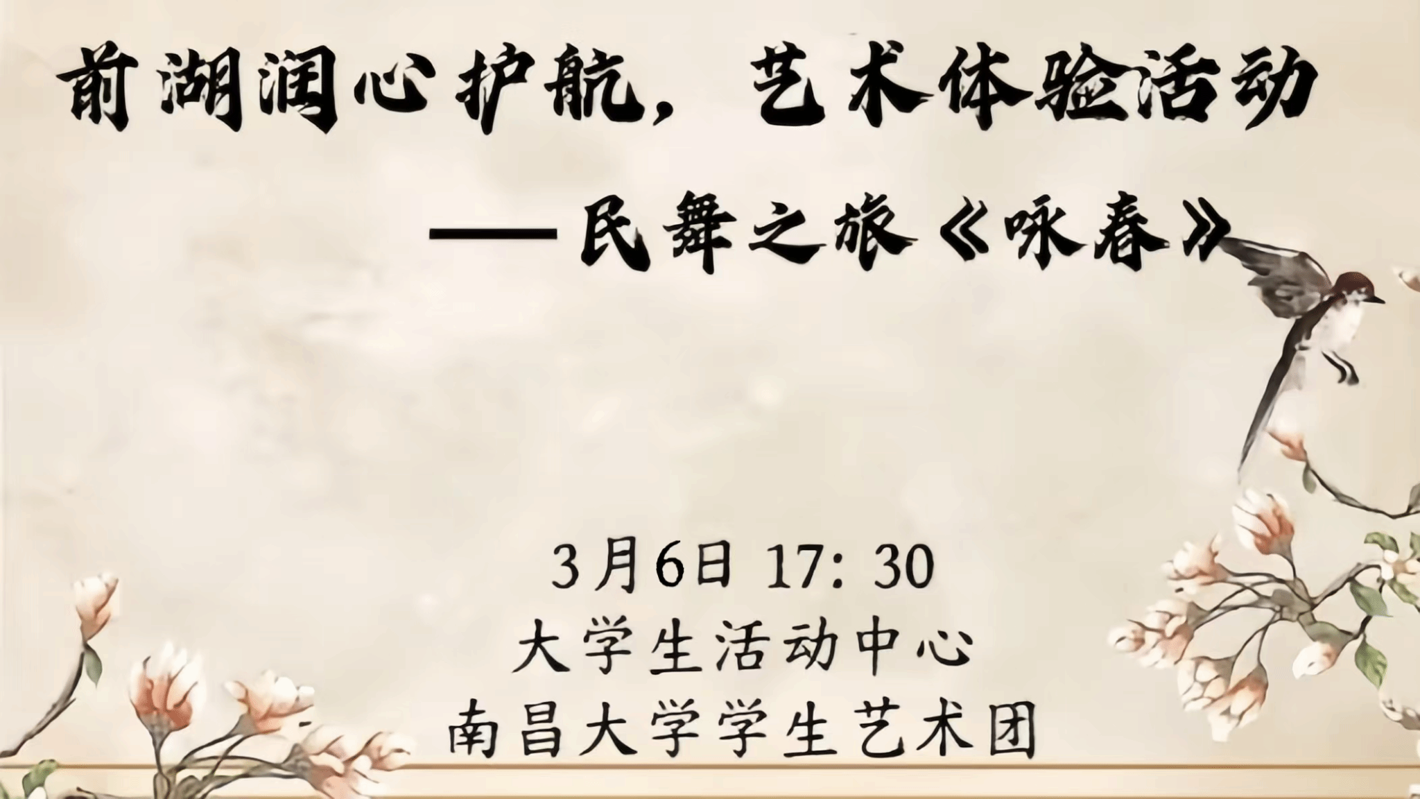 為豐富校園文化生活,助力同學們在藝術中滋養心靈,南昌大學藝術團特舉辦“前湖潤心護航,藝術體驗活動”——民舞之旅《詠春》沙龍活動,誠摯邀請廣大師生一同走進民族舞蹈的詩意世界。通過生動的講解,為大家揭開《詠春》這支舞蹈背后的文化脈絡,講述嶺南文化與傳統武術元素如何巧妙地融入舞蹈動作之中,讓同學們明白每一個舉手投足間蘊含的深厚底蘊。